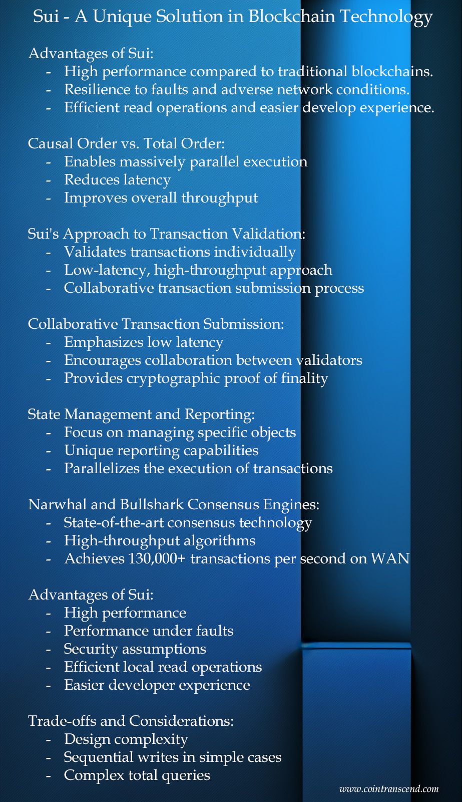 In conclusion, Sui represents a significant step forward in the evolution of blockchain technology. Its focus on high performance, efficient local read operations, and an easier developer experience sets it apart from traditional blockchains and offers numerous benefits for a wide range of use cases. The unique features of Sui, such as causal ordering, an object-centric data model, the Move programming language, and state-of-the-art consensus engines, enable the platform to deliver high throughput, resilience, and scalability.