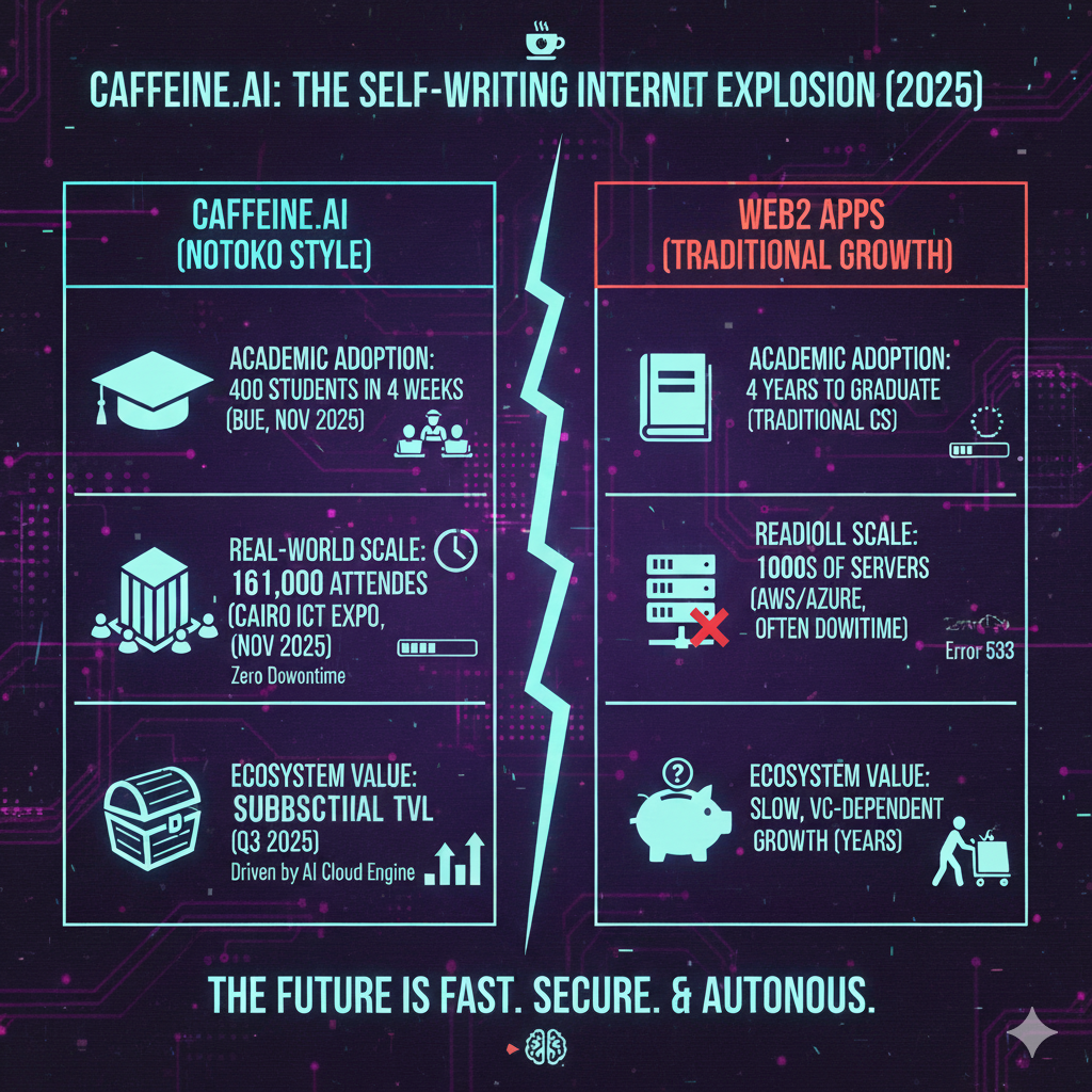 - Cairo ICT Expo: Caffeine powered the tech for 130k attendees, proving that on-chain apps can handle massive, real-world scale without the "AWS sneeze" we feared.