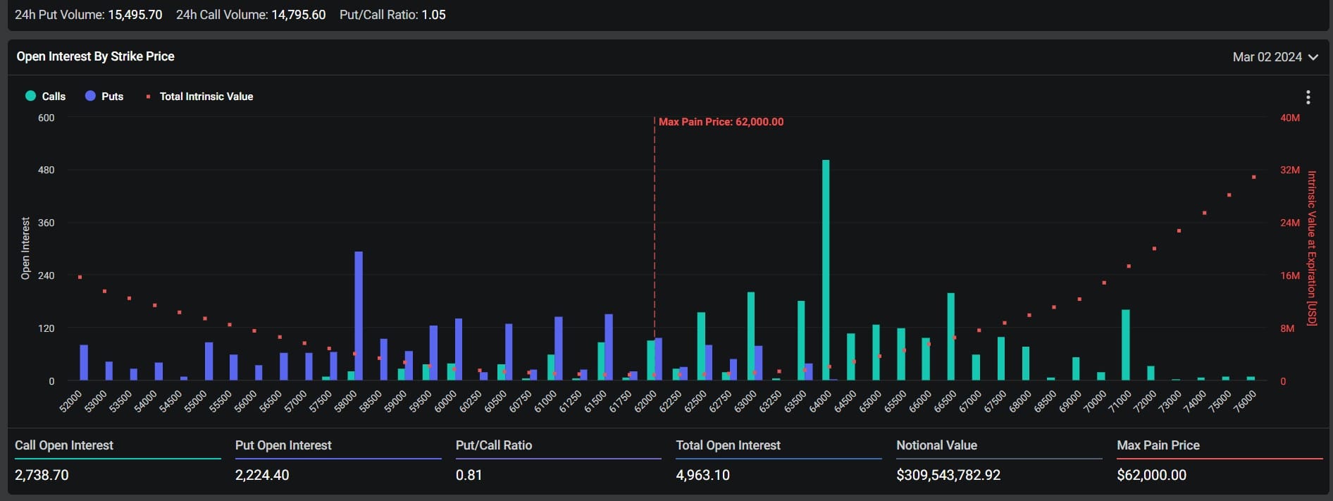 Analysis of open interest reveals key levels that traders are eyeing. Concentrations around $60,000, $65,000, and $70,000 suggest that these could be points of strong support or resistance. A breach above or below these zones could trigger a significant price move in either direction.