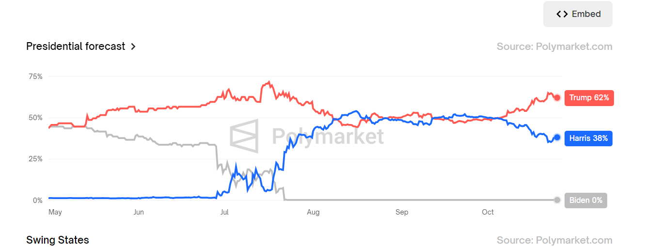 But here’s the kicker: The odds on Polymarket say Trump has a 64% chance of winning, while mainstream political polls have him trailing Harris by the slimmest of margins: 48.5% to 49.3%. Huh? Are the bettors seeing something the polls aren’t, or are they just flexing their wallets to shift the narrative? 🤨